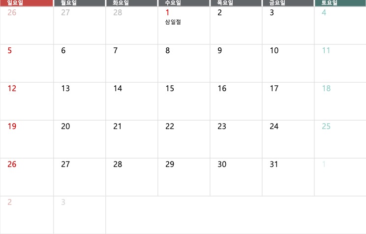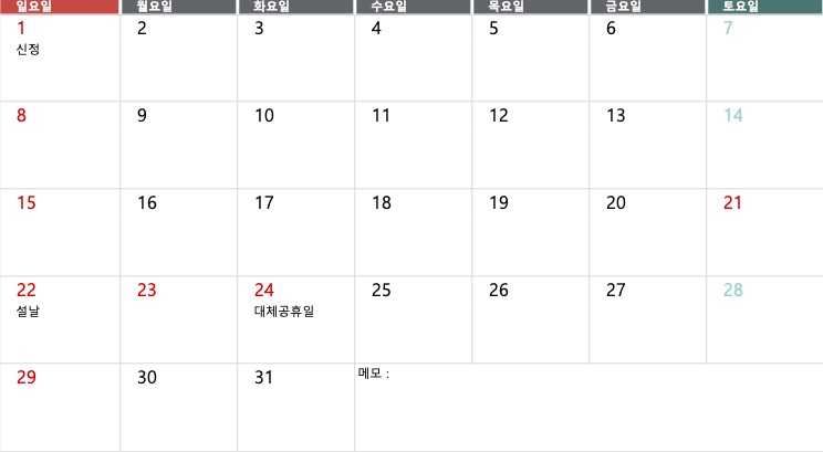 | 휴일 | 설 연휴(1.21 ~ 24) | 삼일절(3.1) | |