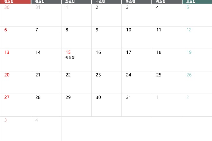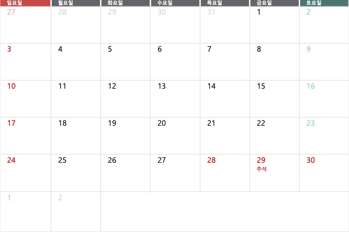| 휴일 | 광복절(8.15) | 추석 연휴(9.28 ~ 30, (일) 10.1) | |