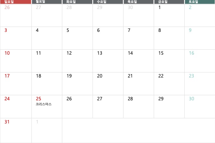 | 휴일 | 개천절(10.3) | 크리스마스(12.25) |