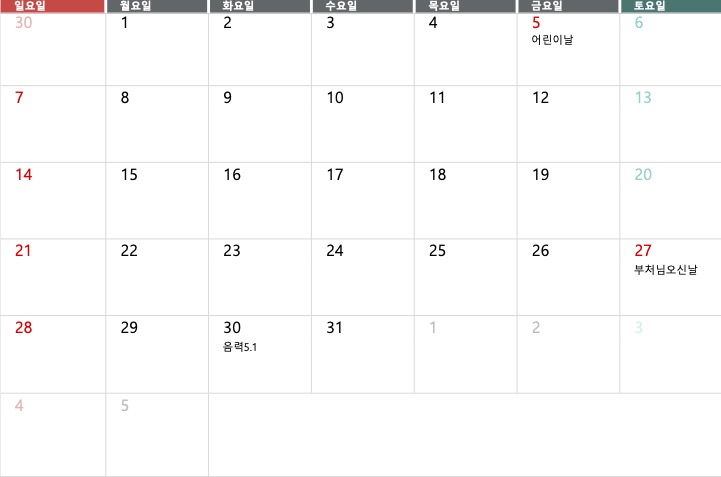 | 휴일 | 어린이날(5.5), 부처님 오신날(5.27) |