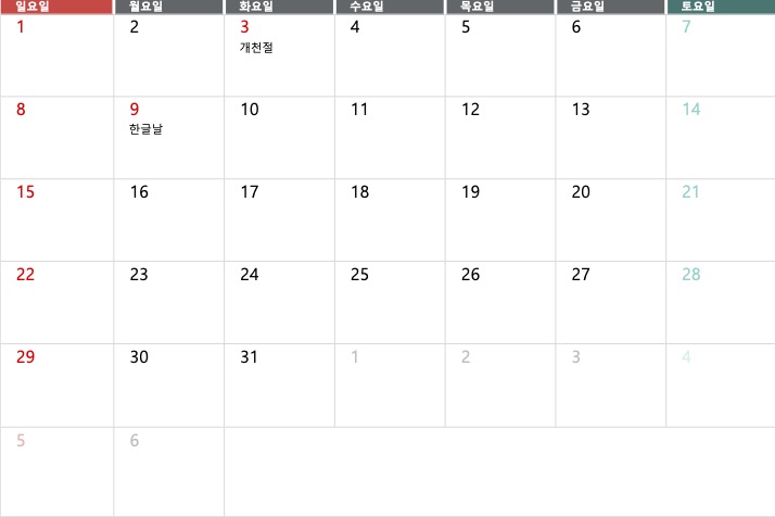 | 휴일 | 개천절(10.3) | 크리스마스(12.25) |