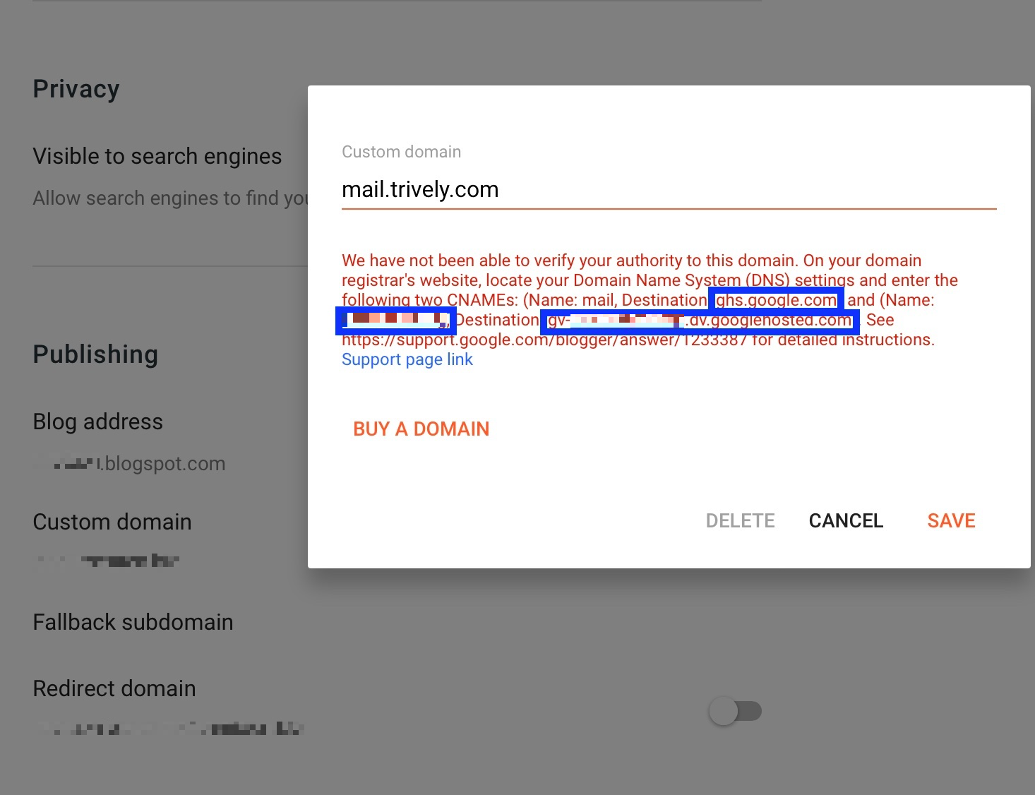 - 도메인 관리사이트에서 사용할 서브 도메인 이름과 인증 코드를 입력합니다. 가비아의 경우, ghs.google.com뒤에 "."를 추가합니다.