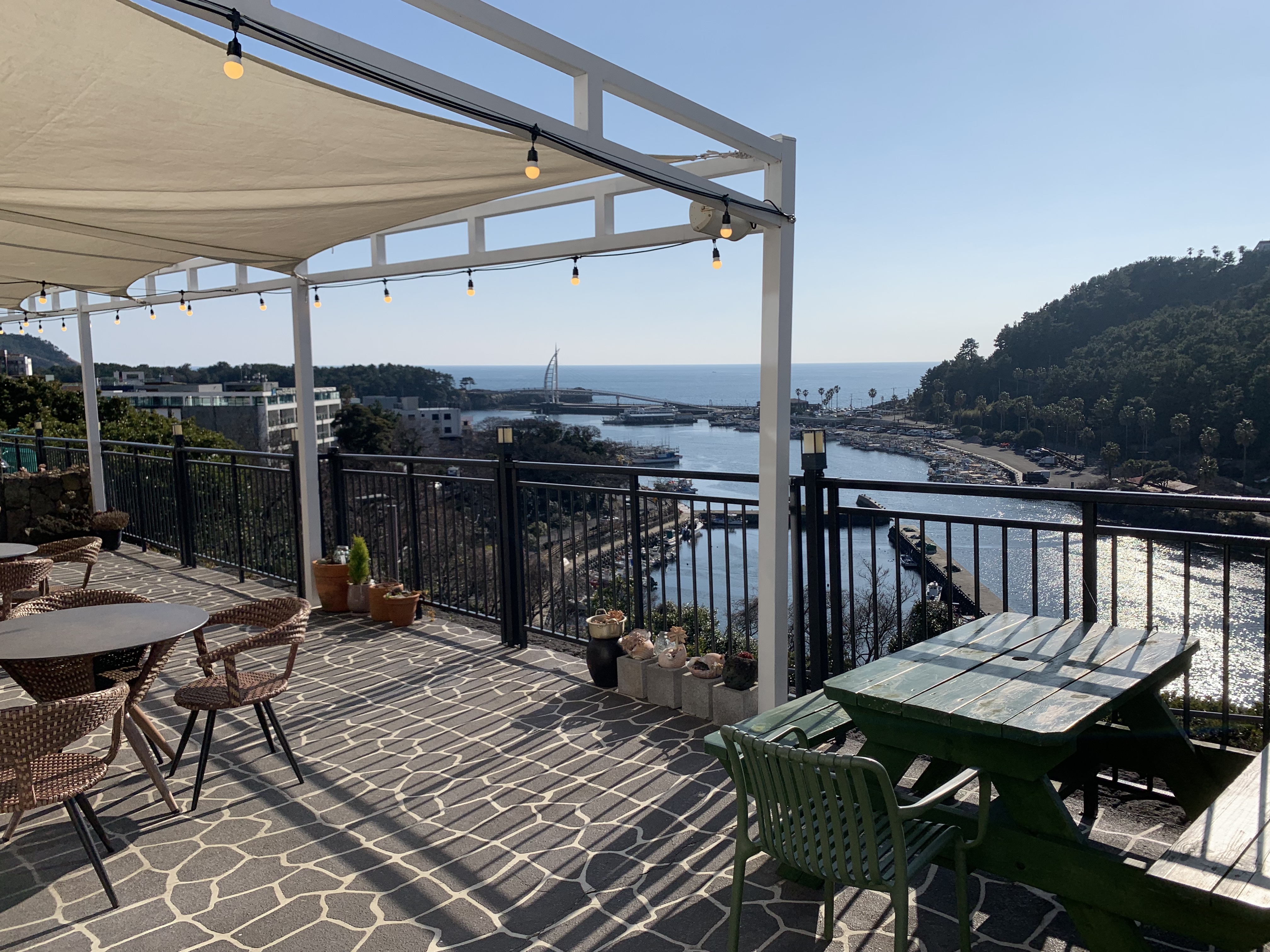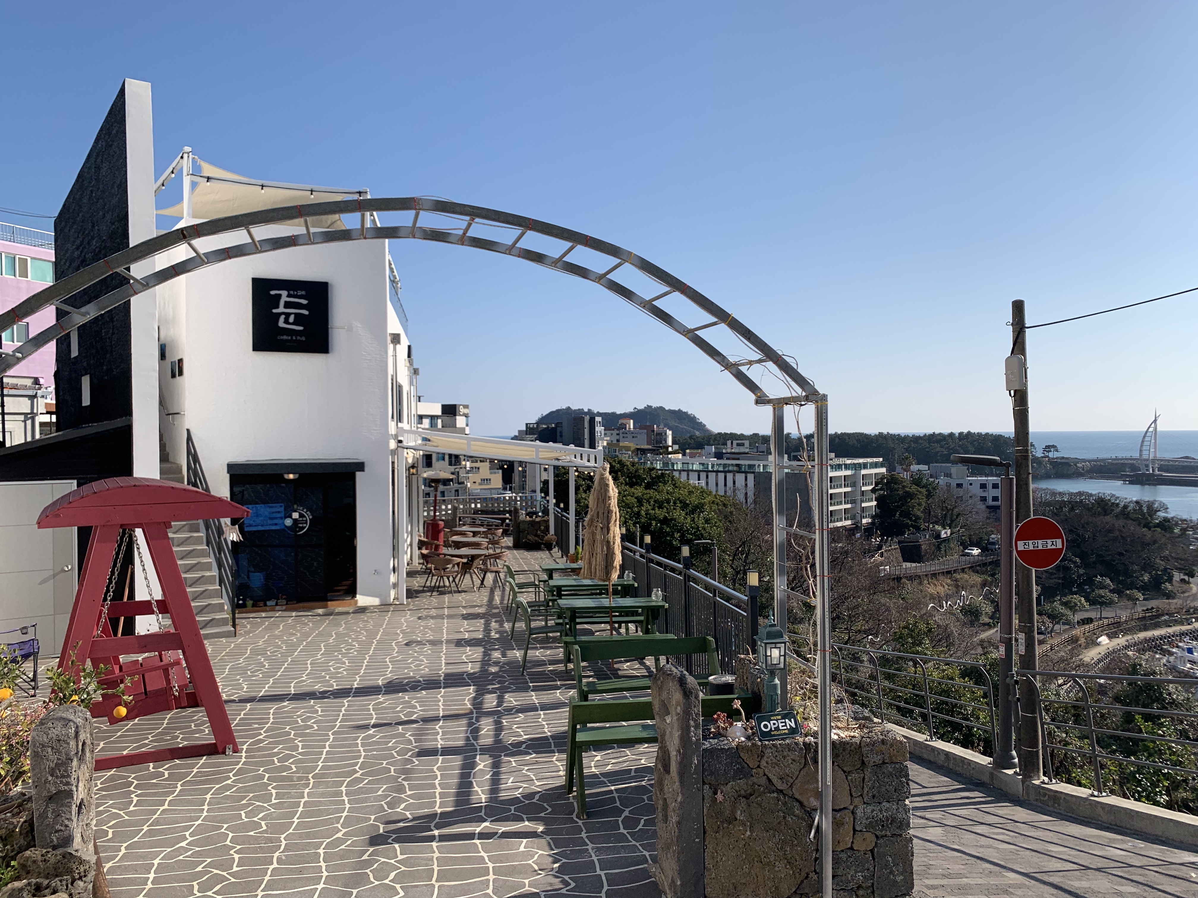 천지연 내려가는 길에 있는 카페 준은 새연교가 바로 보이고, 루프탑이 있어 옥상에서 커피를 마실 수 있습니다. 야외 테이블도 있으며, 맥주도 판매 하고 있어 여름 저녁 때 새연교를 보면서 마실 수 있습니다.