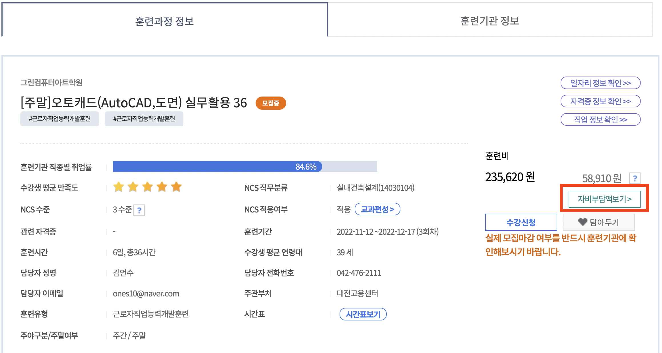 - 훈련과정 검색 후 해당 훈련과정 정보에서 [자비부담액 보기] 눌러 자비부담액 확인