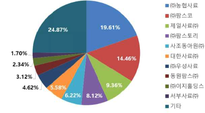배합사료 산업구조는 설비 구축에 비교적 큰 자본이 소요되고 원료의 효율적 구매, 사료 판 매 유통망 구축 등으로 인해 시장 진입장벽이 존재한다. 다만, 일반적인 원료의 조합 또는 배합하는 기술은 상대적으로 낮게 평가되고 있어 다수의 중소기업 업체가 시장에 참가하고 있다. 또한, 국내라는 한정된 시장 내에서 업체들 간의 과다경쟁과 주소비자인 축산 농가들 의 눈높이가 상승함에 따라 경쟁은 점점 더 심화되어 가고 있는 중이다. 배합사료 제조 기업 별 시장점유율에서 한일사료의 경우 1.7% 이하의 점유율을 가지는 것으로 파악된다.