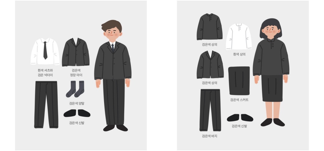 - 화려한 색상의 의복이나 장식은 피하고 검정 계열의 단정한 복장을 기본으로 합니다.
