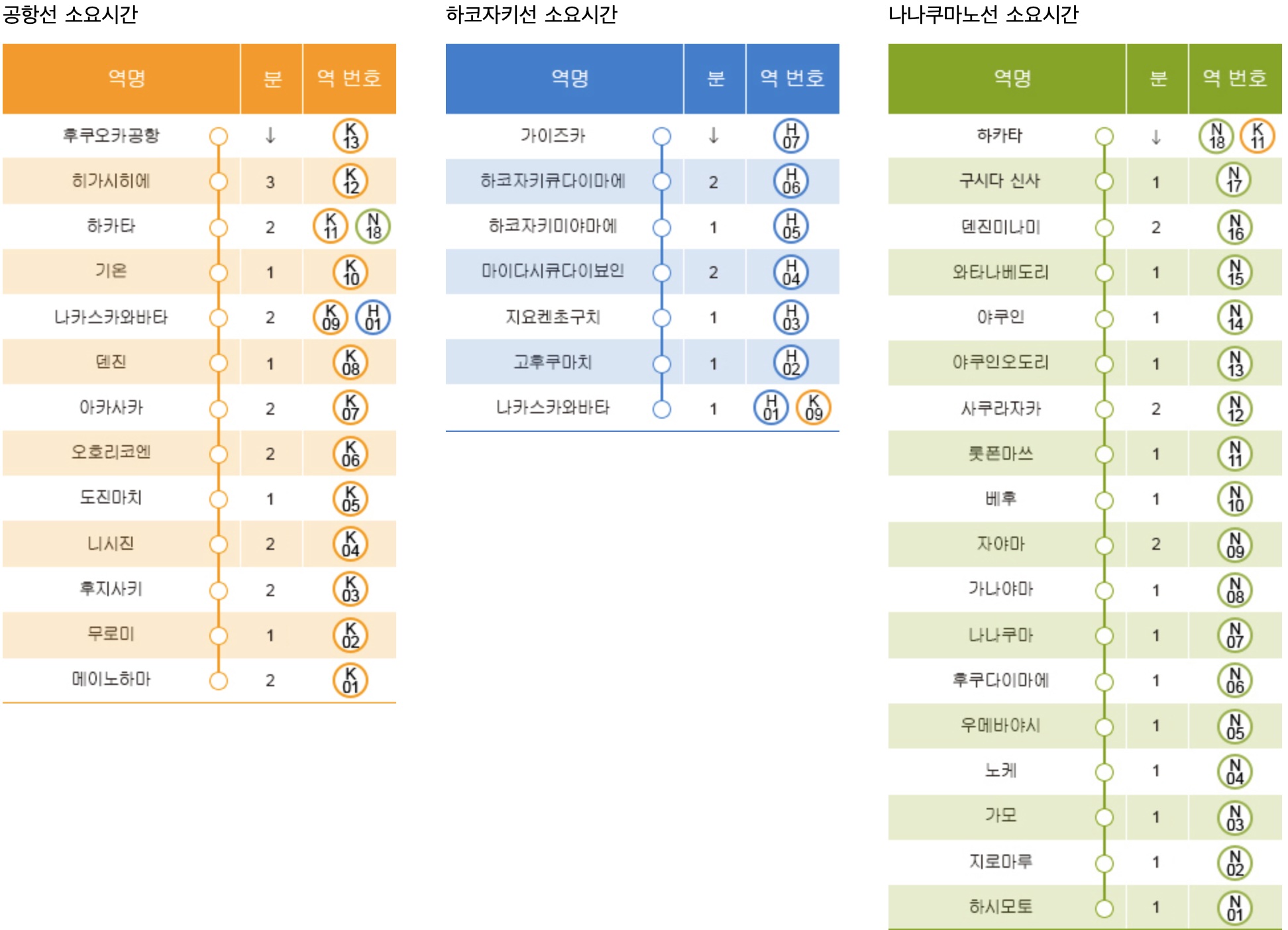 후쿠오카시 지하철 노선 변 소요시간 및 환승 역