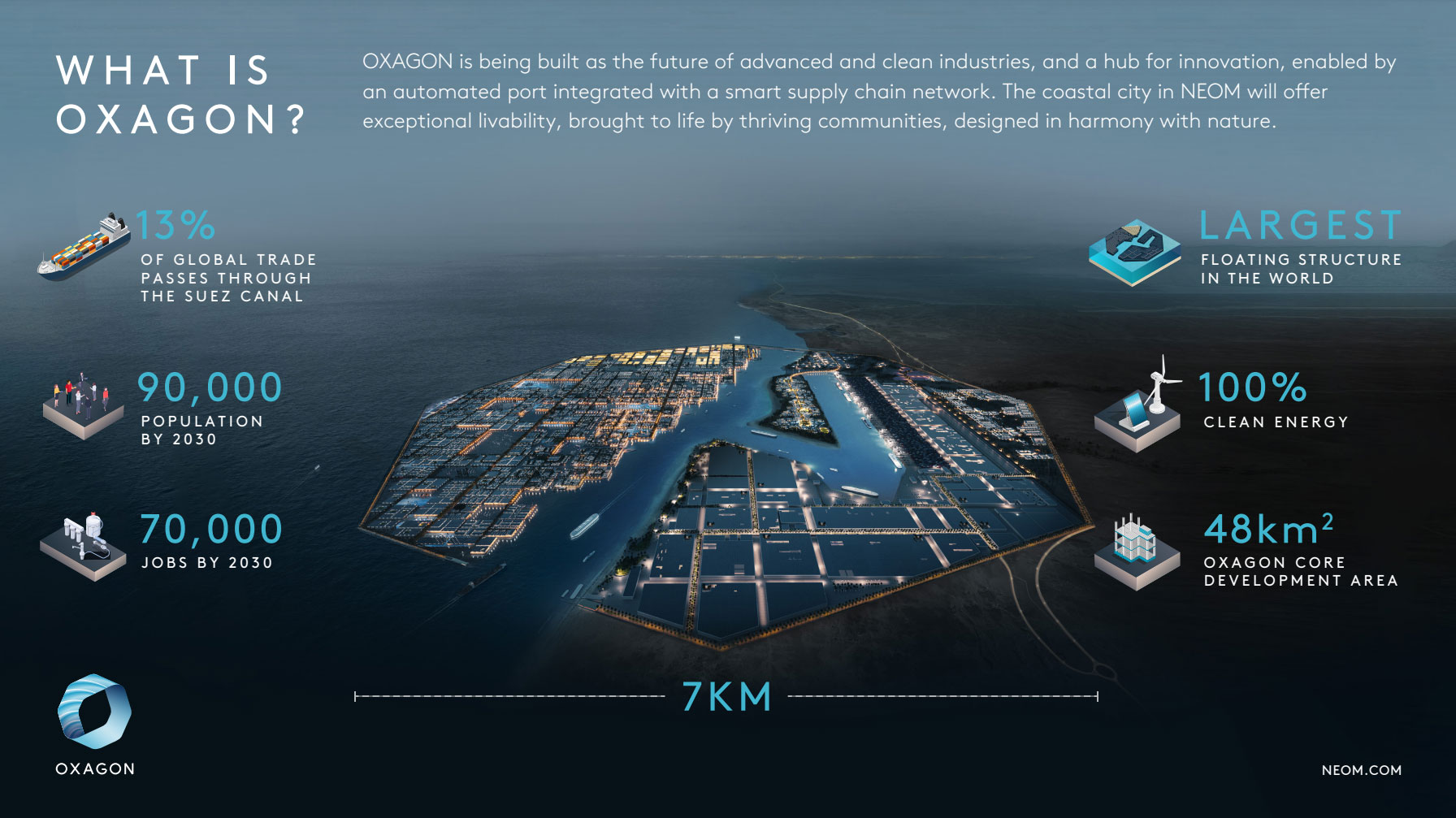 최첨단 산업도시이자 홍해 최대의 항구도시로 팔각형의 구조물이 특징이다. 그것은 7킬로미터 동안 떠다니기 때문에 세계에서 가장 큰 떠다니는 구조물이 될 것으로 예상됩니다. 그것은 두바 마을에서 북서쪽으로 약 25킬로미터 떨어진 곳에 위치해 있고 비행기로 6시간 이내에 세계 어느 도시에도 도달할 수 있다.