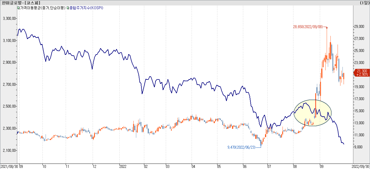 - 8월 코스피지수 하락 구간에서 한미글로벌이 장대양봉으로 코스피지수오 골든크로스를 발생 시켰느데, 이후 오버슈팅이 발생 하면서 코스피지수흐름 과 디커플링 되는 모습을 보여줌