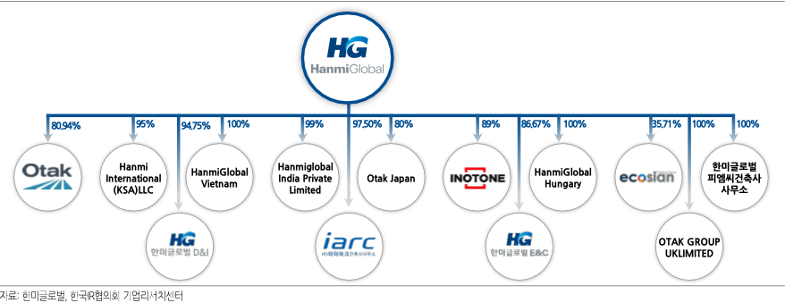 - 한미글로벌은 2011년 미국 현지 PM(개발사업관리) 기업인 오택(OTAK)을 인수, 연결자회사(지분율 80.94%)로 편입
