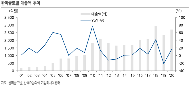 - 한미글로벌의 2021년 실적은 매출액 2,701억원, 영업이익 196억원을 기록하며 전 년대비 성장 하였으며, 2022년 실적은 매출액 3,487억원, 영업이익 284억원을 예상 하고 있음