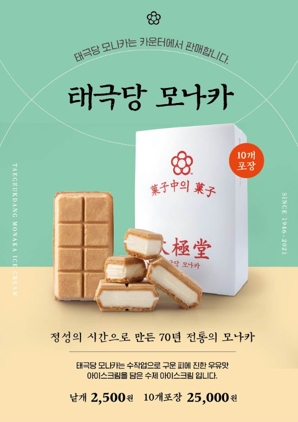 서울에서 가장 오래된 빵집으로 잘 알려져 있습니다. 고소한 과자 안에 찐한 우유 아이스크림이 들어 있는 모나카는 물론 촉촉하고 부드러운 로루케익(롤케이크), 자꾸만 손이 가는 고소한 맛의 전병, 버터 풍미가 한가득인 생크림 빵까지 클래식 스타일의 빵을 주로 판다. 특히, 태극당 모나카가 유명합니다.