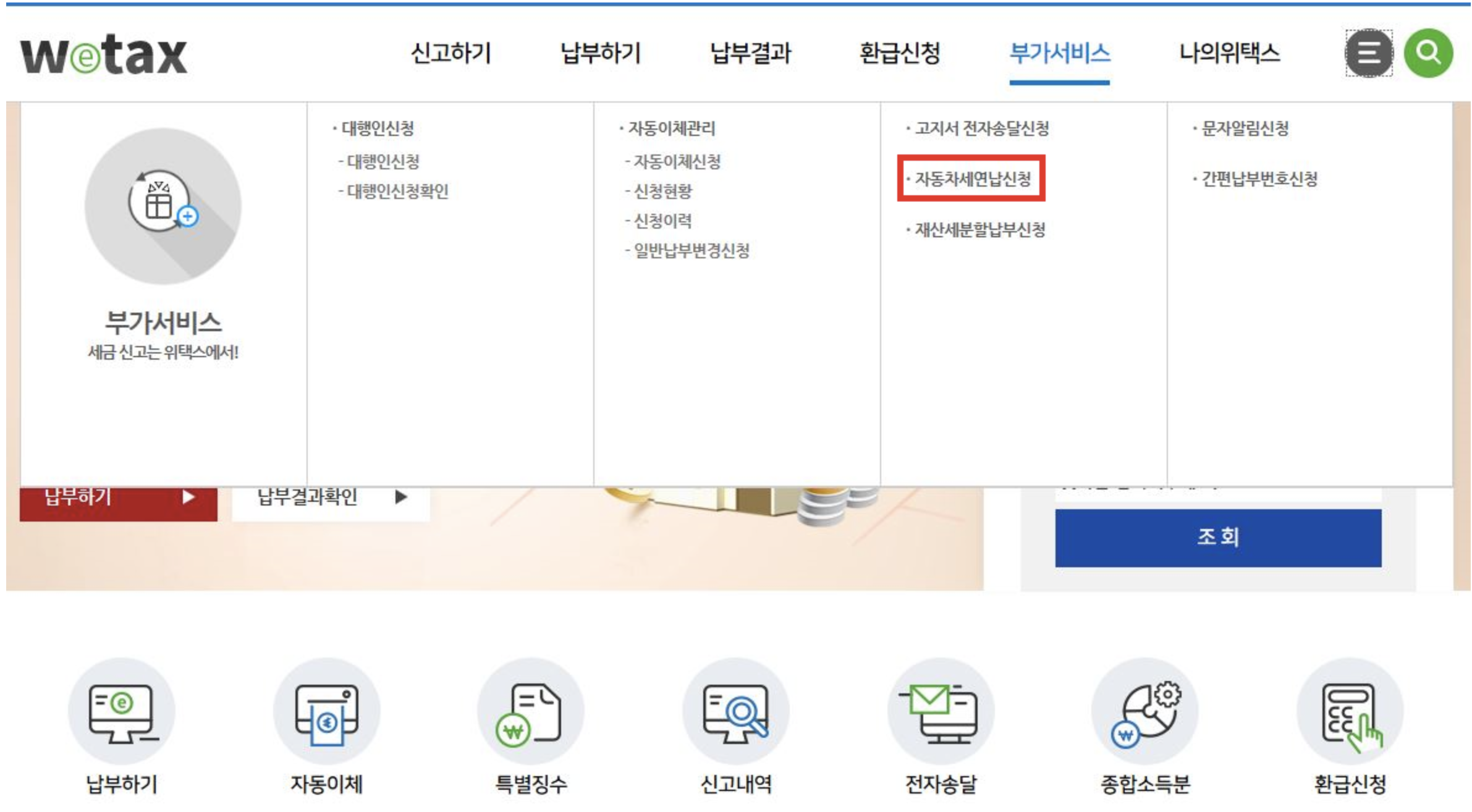 - 회원 : [로그인] → 우측 상단 [전체메뉴] → [부가서비스] → [자동차세 연납 신청]