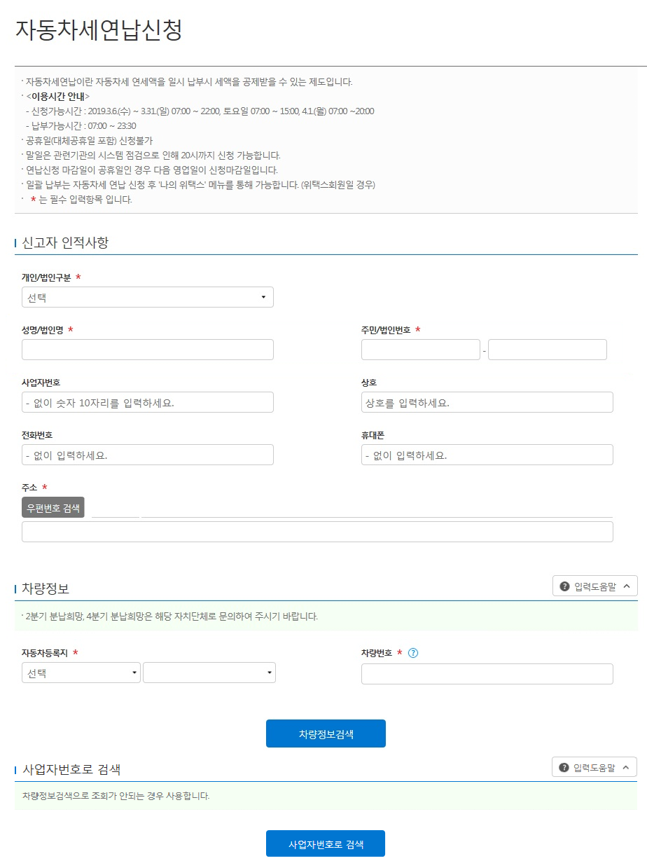 - 비회원 : 우측 상단 [전체메뉴] → [부가서비스] → [자동차세 연납 신청] → [비회원 신고조회] → '신고자 주민/법인번호' 와 '차량번호' 입력 후 [검색]